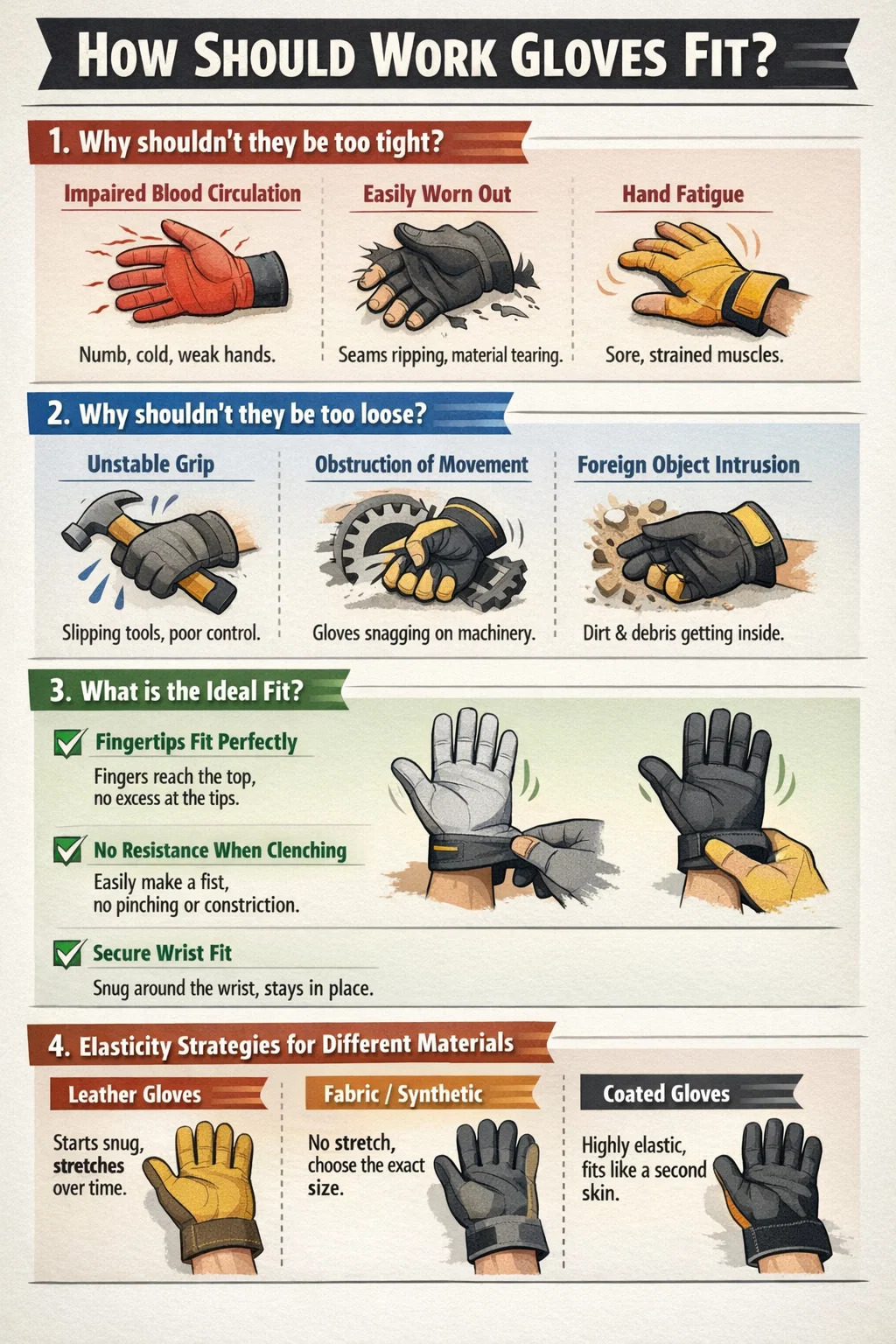 Má tá an limistéar caol na láimhe ró-scaoilte, is féidir le sceallóga adhmaid, gaineamh nó clocha beaga dul isteach sna lámhainní go héasca, rud a fhágann greannú pianmhar.