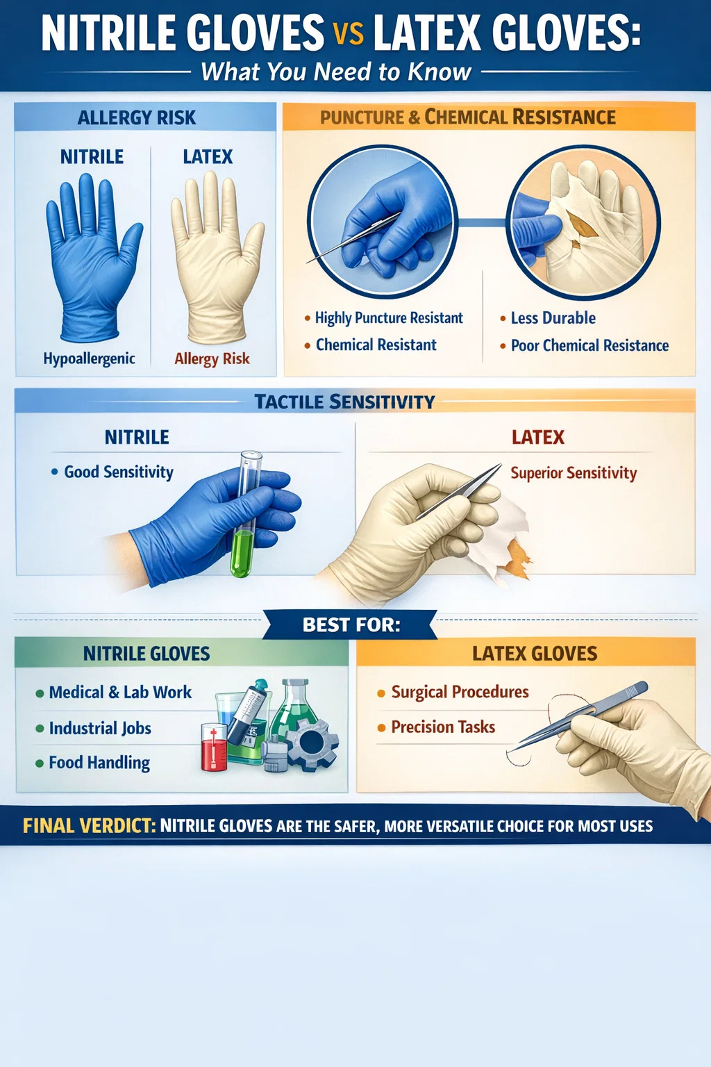 É sin ráite, braitheann “níos sábháilte” ar do chomhthéacs sonrach. Tá buntáistí suntasacha fós ag lámhainní laitéis maidir le híogaireacht thadhlach agus leaisteachas, rud a fhágann gur fearr iad i suíomhanna áirithe máinliachta agus íogaire. Is é sprioc an ailt seo ná na difríochtaí a mhiondealú go soiléir ionas gur féidir leat cinneadh eolasach a dhéanamh bunaithe ar do chás úsáide iarbhír — ní moladh aon-mhéide a oireann do chách.