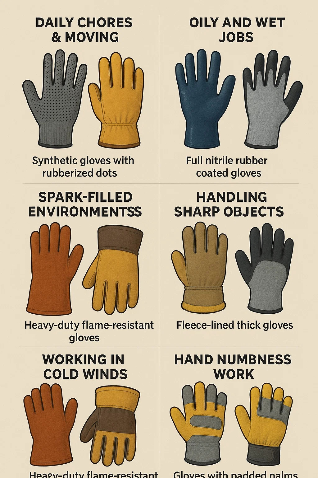 Níl aon fhreagra amháin a oireann do chách nuair a roghnaíonn tú fíor-mhaith lámhainní oibre —Braitheann an péire is fearr go hiomlán ar an bpost atá á dhéanamh agat. Is í an eochair ná an chosaint agus an fheidhm is oiriúnaí a aimsiú. Seo na cineálacha is fearr le haghaidh cásanna coitianta: