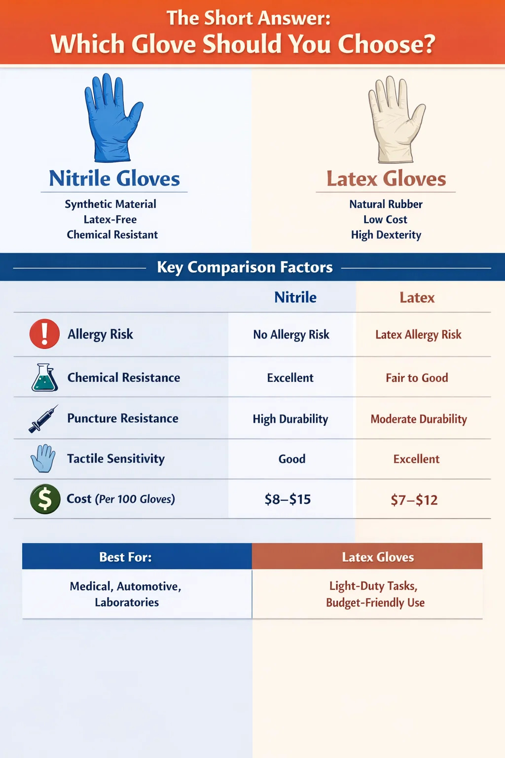 Déanann an tábla seo a leanas achoimre ar na príomhdhifríochtaí idir lámhainní nítríle agus laitéis thar na fachtóirí feidhmíochta agus praiticiúla is tábhachtaí: