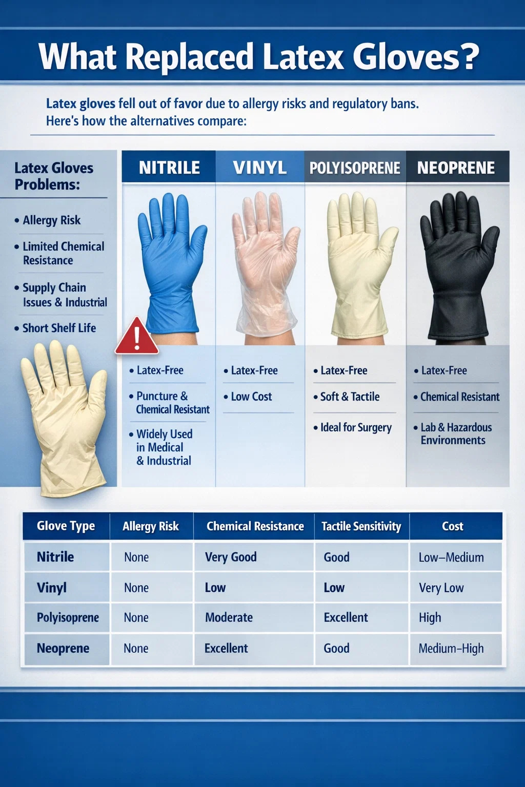 Mar sin féin, i dtimpeallachtaí cúram sláinte rialaithe i margaí forbartha, tá lámhainní laitéis imithe i léig go héifeachtach. Tá freagra soiléir ar an gceist cad a cuireadh in ionad lámhainní laitéis sna comhthéacsanna sin: rinne nítríle, le polyisoprene a chlúdaíonn an nideoige beachtais máinliachta. I margaí tomhaltóra agus tionsclaíocha níos leithne, tá an freagra níos éagsúla - ach tá treo an taistil ar shiúl ó laitéis agus i dtreo roghanna eile sintéiseacha a chuireann deireadh le riosca ailléirge gan comhréiteach suntasach ar fheidhmíocht.