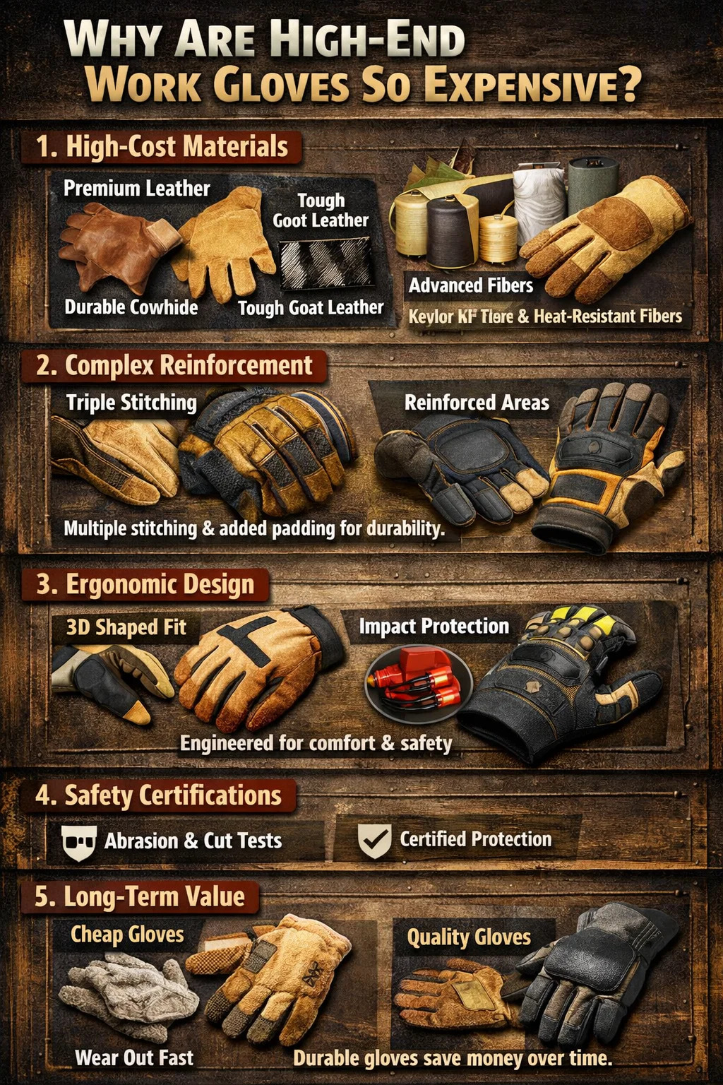 I ndáiríre, is minic a bhíonn an praghas ard ar lámhainní oibre mar gheall ar an iarracht shuntasach a dhéantar ar ghnéithe nach bhfeiceann tú. Go simplí, tá an costas go príomha mar gheall ar na fachtóirí seo: